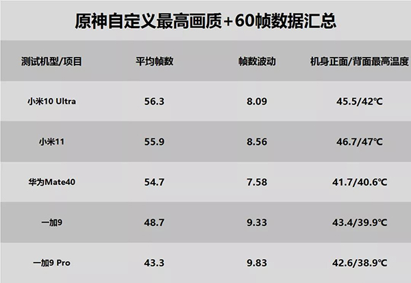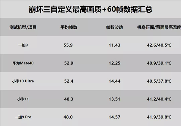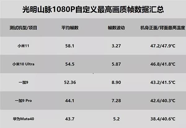 《光明山脈》中,一加9勉強突破50幀大關(guān),但幀數(shù)波動較大,機身溫度相對性能釋放激進的小米兩款機型要低一些。而一加9 Pro平均幀數(shù)和佛系的Mate40差不多,幀數(shù)波動稍大,正面溫度高了4℃,綜合體驗不如Mate40。