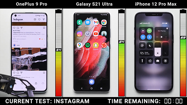 一加9 Pro、三星S21 Ultra、iPhone 12 Pro Max這三部手機(jī)在運(yùn)行一段時(shí)間之后,電池電量百分比分別為54%、64%、69%,電池電量百分比最高的是iPhone 12 Pro Max、其次是三星S21 Ultra、電池電量百分比最低的是一加9 Pro,從目前的測(cè)試結(jié)果來看,電池電量最少的iPhone 12 Pro Max在電池續(xù)航能力表現(xiàn)方面,要比其他兩部電池電量很高的手機(jī)續(xù)航時(shí)間更長(zhǎng)。