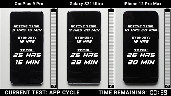 手機(jī)性能現(xiàn)在已經(jīng)不再是消費(fèi)者關(guān)注的重點(diǎn),手機(jī)的電池續(xù)航能力反而成為了大家關(guān)注的對(duì)象。不過手機(jī)的續(xù)航能力強(qiáng),并不是電池容量足夠大就可以的,還和手機(jī)整體的性能優(yōu)化有著很大的關(guān)系。一加9 Pro、三星S21 Ultra、iPhone 12 Pro Max這三部手機(jī)均是頂級(jí)旗艦手機(jī),那么在電池續(xù)航方面,這三部手機(jī)都有著什么樣的表現(xiàn)呢,讓我們一起來看下這三部手機(jī)的電池續(xù)航能力測(cè)試。