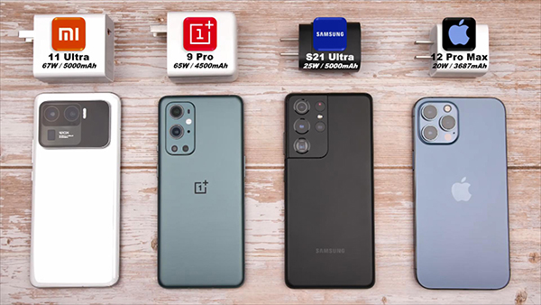 手機(jī)快充技術(shù)已經(jīng)成為了手機(jī)長時(shí)間續(xù)航的有力支撐手段之一,很多國產(chǎn)手機(jī)廠商都喜歡把手機(jī)的快充技術(shù)進(jìn)行大幅度的提升。小米11 Ultra、一加9 Pro、三星S21 Ultra、iPhone 12 Pro Max這4部手機(jī)是頂級旗艦手機(jī),所以消費(fèi)者也非常關(guān)注這4部手機(jī)的電池快充速度表現(xiàn)如何。