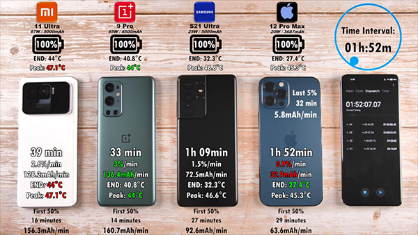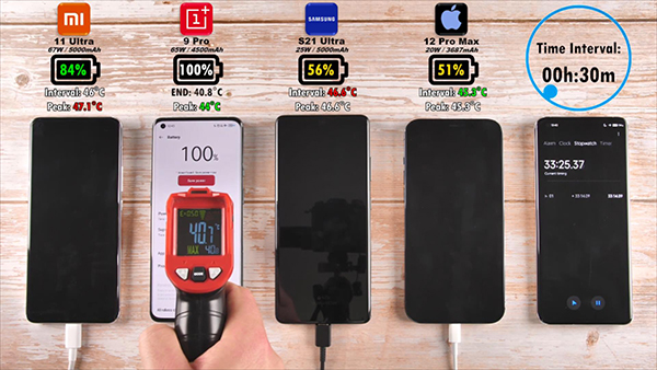 小米11 Ultra、一加9 Pro、三星S21 Ultra、iPhone 12 Pro Max這4部手機(jī)的電池容量分別為5000毫安、4500毫安、5000毫安、3687毫安,快充規(guī)格分別為67W、65W、25W、20W,快充規(guī)格最高的是小米11 Ultra、快充規(guī)格最低的是iPhone 12 Pro Max,那么這4部手機(jī)的充電時(shí)間哪個(gè)最快呢?讓我們一起來看下測試過程。