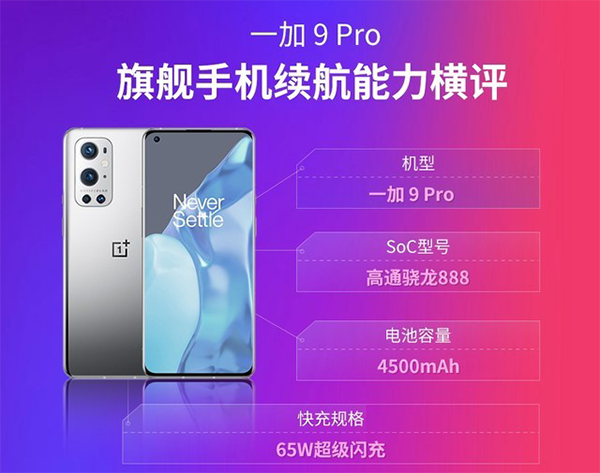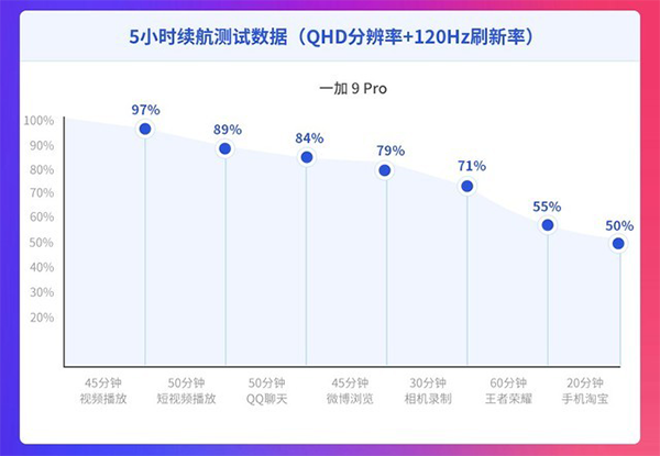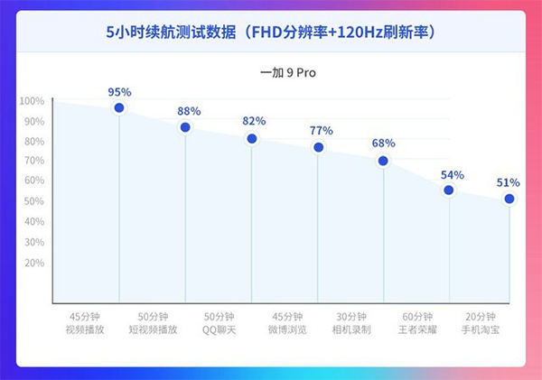 在本次橫評中一加9 Pro表現(xiàn)十分均衡,在QHD和FHD兩種分辨率的5小時續(xù)航測試項目中均剩余了50%以上的電量;配合65W超級快充,日常使用并沒有太大壓力。
