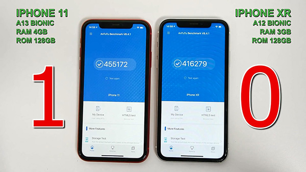 在安兔兔跑分軟件的跑分結(jié)果顯示,iPhone 11的跑分為455172分,iPhone XR的安兔兔跑分為416279分,iPhone 11比iPhone XR的安兔兔跑分要多4萬分,所以第一輪的測試結(jié)果,iPhone 11比iPhone XR要好,第一輪測試iPhone 11獲勝。