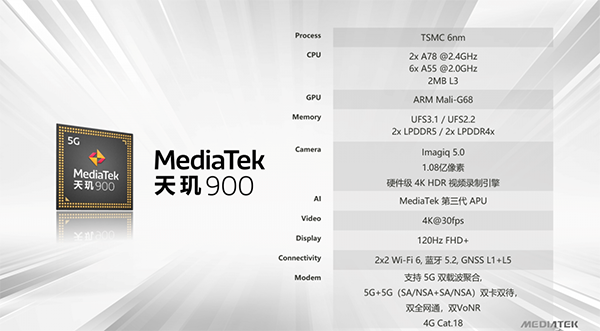 作為天璣家族的第12名成員,聯(lián)發(fā)科對天璣900還是寄予厚望的,6nm工藝、A78大核、于Mali-G78同源的Mali-G68 GPU、UFS3.1、LPDDR5、4K HDR視頻錄制、1.08億像素攝像頭、5G全網(wǎng)通、Wi-Fi 6、藍牙5.2等原本屬于旗艦級或準旗艦級的特性都被塞到了天璣900身上,而且還不排除聯(lián)發(fā)科再次聯(lián)合某手機品牌推出定制款天璣920(進一步提升主頻,增加GPU計算核心)的可能。