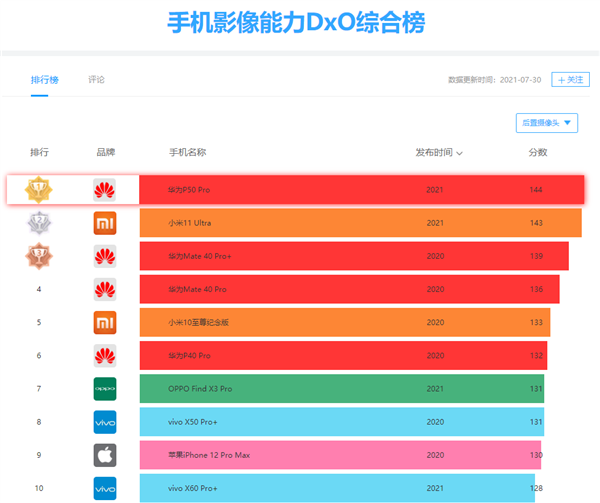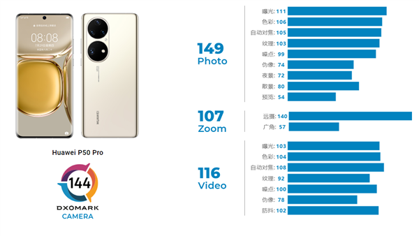 華為剛剛發(fā)布的新旗艦P50 Pro,DxOMark評測成績已經(jīng)出爐,總分高達(dá)144分,以一分優(yōu)勢力壓小米11 Ultra,重回世界第一,DxOMark稱其為“所有領(lǐng)域的翹楚”。其中,拍照子項(xiàng)成績149分,領(lǐng)先小米11 Ultra 1分,變焦子項(xiàng)成績107分,領(lǐng)先小米10至尊版多達(dá)6分,視頻子項(xiàng)成績116分,落后小米11 Ultra 1分。