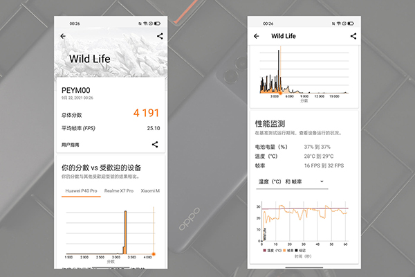3DMARK是測(cè)試手機(jī)GPU性能的軟件,其中的Wild Life選項(xiàng)是一個(gè)跨平臺(tái)的基準(zhǔn)測(cè)試程序,用于對(duì)比最新移動(dòng)設(shè)備的圖形性能。OPPO K9 Pro在3DMARK Wild Life測(cè)試項(xiàng)目中得分4191分。值得一提的是,在整個(gè)測(cè)試過(guò)程中,手機(jī)溫度基本維持在29℃左右,而高通旗艦級(jí)芯片驍龍888 Plus的Wild Life測(cè)試溫度在36℃左右,由此可見(jiàn),OPPO K9 Pro的散熱性能實(shí)屬優(yōu)秀。