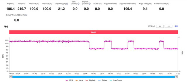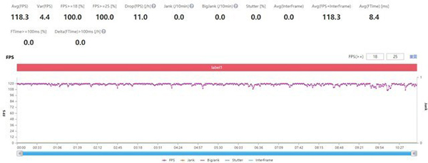 通過筆者對兩款手機(jī)進(jìn)行各10分鐘的《王者榮耀》測試,我們可以看到iQOO 9 Pro的幀率高達(dá)118.3,而小米12 Pro因?yàn)槌霈F(xiàn)了降頻掉幀的情況,導(dǎo)致它的幀率只有106.4FPS。