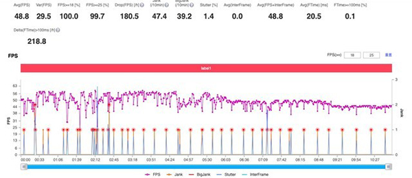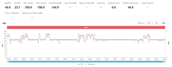 當(dāng)我將iQOO 9 Pro開啟幀率提升模式(插幀)后,雖然PerfDog記錄到的幀數(shù)有所下降,但實(shí)際幀數(shù)已經(jīng)提升到了90FPS(頁面切換時,由于插幀,會產(chǎn)生幀率波動),不僅體驗(yàn)上讓我感覺更為流暢,同時在激烈的戰(zhàn)斗場景下,它也會相比于未開啟插幀時,為我提供更為穩(wěn)定、不卡頓的游戲狀態(tài)。