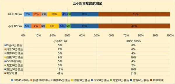 從上圖我們可以看到,小米12 Pro與iQOO 9 Pro在續(xù)航方面的表現(xiàn)可以說是難分伯仲,兩者在經(jīng)過5小時(shí)的重度使用后,仍能剩余近一半左右的電量,完全可以滿足我們一天的正常使用需求,做到一天一充更是毫無難度。