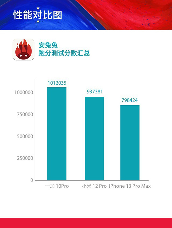 為了能更加直觀的讓大家了解到這三款手機的性能,我們采用安兔兔跑分軟件對其進行性能測試。通過測試我們不難看出,一加10 Pro在跑分上是有一定優(yōu)勢的,憑借1012035分領(lǐng)先于其他兩款機型,可以看得出來一加在性能儲備上還是非常充裕的。iPhone 13 Pro Max由于適配問題,在安兔兔中僅拿到了798424分,遠低于其真實水平,沒有太多參考價值。