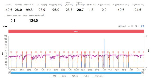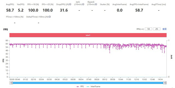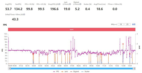 一加10 Pro在游戲?qū)崪y中的表現(xiàn)仍然很優(yōu)秀,在滿幀60幀的情況下取得了58.7幀的成績,幾乎實現(xiàn)了滿幀運行。通過幀率圖,我們不難看出一加10 Pro在開局后十分鐘非常穩(wěn)定流暢的,雖然會發(fā)生間隔性掉幀,但并不會對游戲體驗產(chǎn)生過多的影響。而在后五分鐘,隨著游戲時間的增加,幀率開始變得活躍起來,出現(xiàn)了不規(guī)則的跳動。