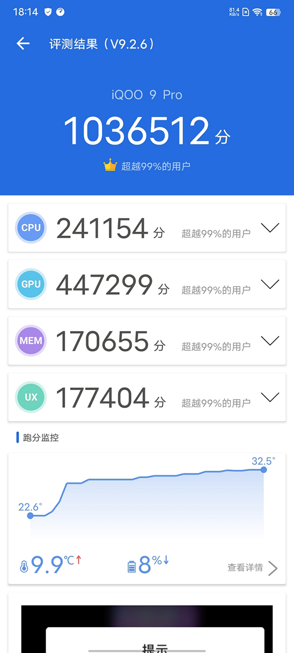 這款手機(jī)的基礎(chǔ)就打得很牢,它采用了全新一代驍龍8 處理器、超頻版UFS 3.1以及增強(qiáng)版LPDDR5,這些核心硬件均是行業(yè)頂尖的高規(guī)格配置,能讓手機(jī)具備強(qiáng)悍的綜合性能實(shí)力。目前可買到的量產(chǎn)版的新驍龍8 Gen1處理器的機(jī)型不是很多,iQOO 9 Pro實(shí)測跑分輕松能上100萬。