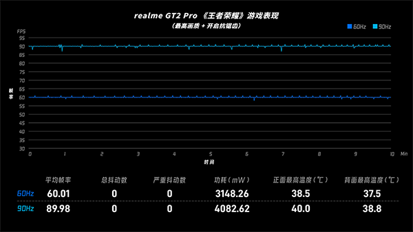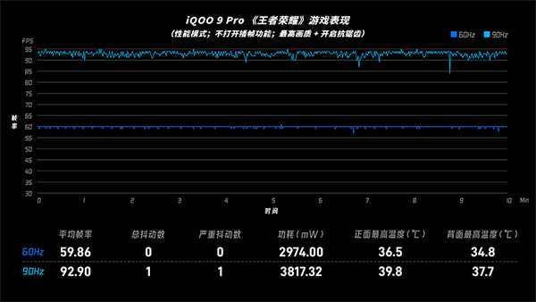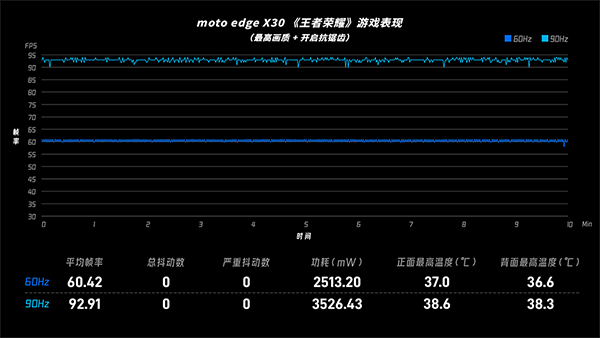 先看國民游戲「王者榮耀」,各機型都測試了60fps和90fps兩種幀率模式。