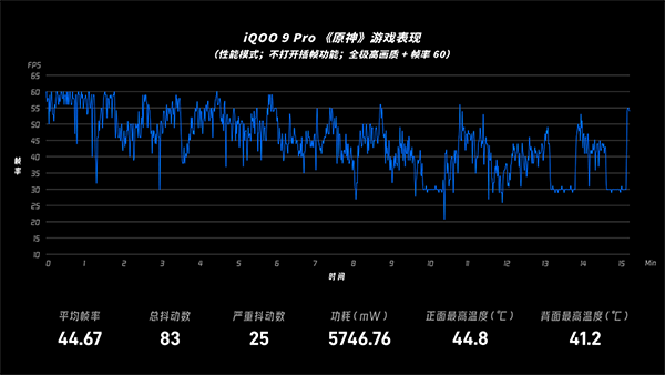 一上「原神」,四款旗艦的畫風大變,意料之中,沒有一條幀率波形圖是平整的,特別是近期發(fā)布的iQOO 9 Pro幀率波動最大,10分鐘的游戲中我們也錄得它產(chǎn)生了83次幀率抖動,其中有25次較嚴重的抖動,平均幀率44.7fps,不過它的功耗和溫控是四者中做得最好的——可見iQOO 9 Pro應(yīng)付高負載場景時,優(yōu)先保功耗和溫控。