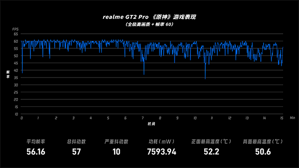 小米、moto、realme的平均幀率都能達到50fps以上,其中本年第一個工作日發(fā)布的realme GT2 Pro平均幀率56.2fps,10分鐘內(nèi)共出現(xiàn)了57次畫面幀率抖動(包含10次較嚴重抖動),而功耗和溫度是四者中最高的——看來realme GT2 Pro的策略與vivo的iQOO 9 Pro相反,相對更看重性能。