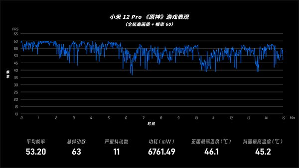 而小米的12 Pro可以說是在realme與iQOO之間找一個相對平衡的點,45.2℃的背部溫度、53.2fps的平均幀率,讓游戲性能和握持體驗都能兼顧得到。