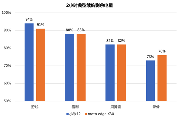 從結(jié)果來看,摩托羅拉edge X30與小米12剩余電量分別為76%和73%,摩托羅拉edge X30續(xù)航表現(xiàn)勝出。子項方面:摩托羅拉edge X30游戲消耗較多,看劇半小時耗電3%很讓人驚喜;小米前三項非常平均,但錄像消耗9%,偏多了。雖然摩托羅拉edge X30與小米12二者電池容量不同,但續(xù)航水準(zhǔn)都能滿足一天使用需求。
