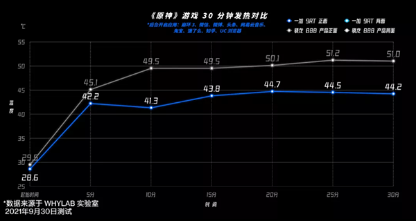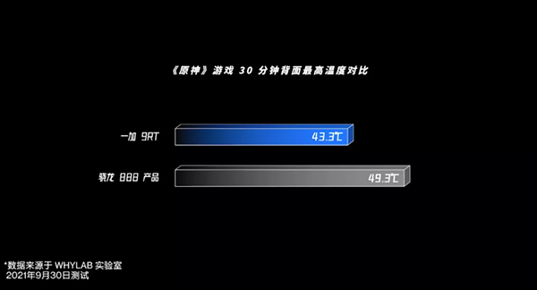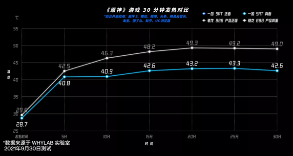 根據(jù)后臺開啟10款應(yīng)用時連續(xù)運(yùn)行《原神》游戲30分鐘的結(jié)果,WHYLAB發(fā)現(xiàn)參與評測的手機(jī)很少會有低于48°C的情況,大多手機(jī)會飆到50°C上下,而一加9RT背面溫度最高僅43.3°C。由此可以看出,一加9RT手機(jī)的立體空間散熱系統(tǒng)的實(shí)力,以及調(diào)教優(yōu)化能力的強(qiáng)大,而“冷靜”的背后,則是更流暢用戶體驗(yàn)的全面保障。