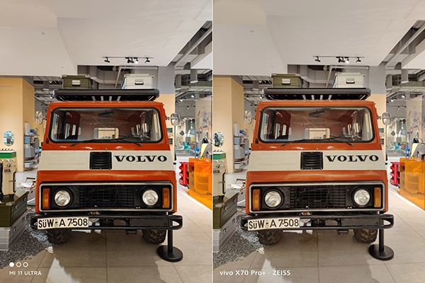 先看一組關(guān)于展示車的室內(nèi)樣張,從整個畫面來說,它們給我的成像效果是非常接近的,明暗曝光均衡,色調(diào)又一致,不存在光學(xué)問題,屬于高質(zhì)量輸出,不過如果我們放大當(dāng)中細(xì)節(jié),比如車牌位置,能發(fā)現(xiàn)小米11 Ultra的畫面細(xì)節(jié)更加豐富,車牌號碼邊緣沒有涂抹感,這反映出GN2超大底的感光優(yōu)勢。