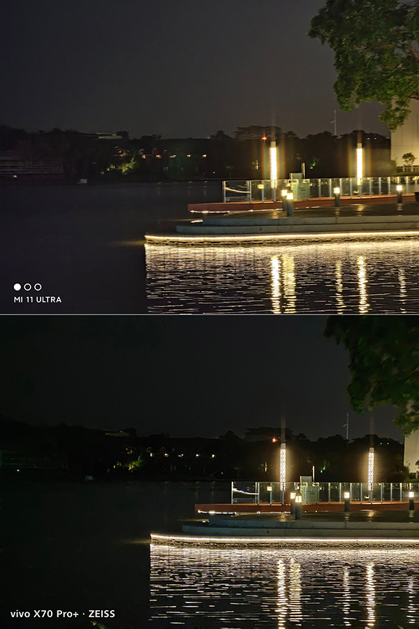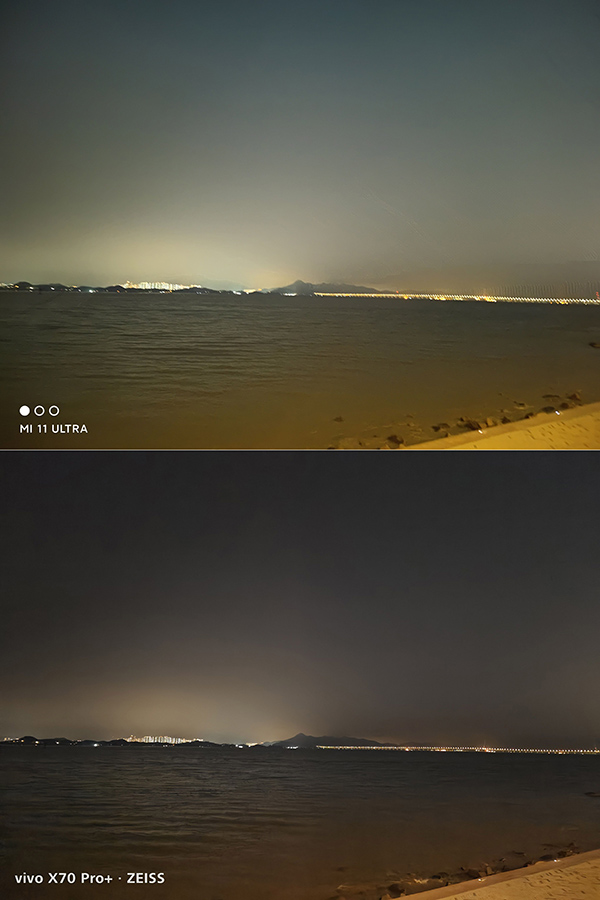 再看兩組夜景樣張,我們能明顯看到vivo X70 Pro+的夜景成像更有畫面感,在壓制曝光之余,還兼顧到整個畫面的純凈度,并且沒有眩光、雜散光的問題,而這點(diǎn)小米11 Ultra就有待完善了。所以不難判斷,vivo X70 Pro+能在后攝系統(tǒng)上采用了蔡司T*鍍膜和玻璃鏡片,如此一來就提高了鏡頭進(jìn)光量和成像純凈度,減少了光學(xué)問題,直出好看的夜色照片。