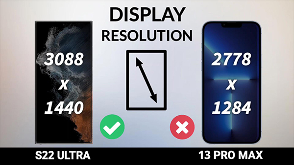 三星S22 Ultra的屏幕尺寸為6.8英寸,比iPhone 13 Pro Max的6.7英寸的屏幕稍微大一些,同時在屏幕分辨率方面,三星S22 Ultra的屏幕分辨率為1440X3088像素,iPhone 13 Pro Max的屏幕分辨率為1284X2778像素。在屏幕的分辨率和尺寸方面,三星S22 Ultra要比iPhone 13 Pro Max更勝一籌。