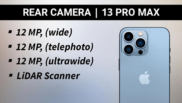 iPhone 13 Pro Max搭載的三枚相機鏡頭組合,分別是1200萬像素的長焦相機、1200萬像素的主攝、1200萬像素的超廣角相機和雷達激光掃描鏡頭LIDAR。