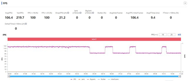 從實(shí)際游戲測(cè)試來看,在《王者榮耀》120幀模式下,一加10 Pro平均游戲幀率達(dá)到了118.3fps,小米12 Pro平均幀率只有106.4fps。一局游戲中,一加10 Pro的表現(xiàn)還是非常穩(wěn)定的,全程也能保持一個(gè)較高的幀率狀態(tài)。相比之下,小米12 Pro在游戲后半程開始出現(xiàn)頻繁的鎖幀情況,甚至一度降到90fps的水平。