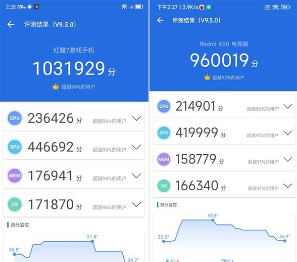 可以看到,紅魔7的跑分是要明顯高于Redmi K50電競版的。雖然這兩次跑分結(jié)果相比官方宣傳稍低,不過在日常使用、游戲中手機(jī)溫度35度上下才是最常用的使用環(huán)境,日常體驗(yàn)環(huán)境中才是最有說服力的。