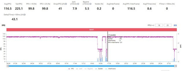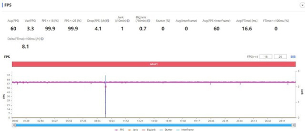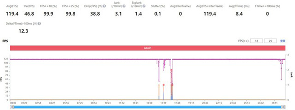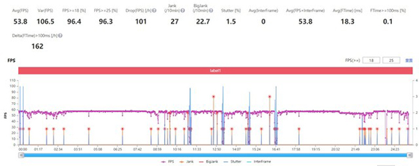 我們先從國民游戲《王者榮耀》開始測起,30分鐘結(jié)果如下:(中間卡頓為退出游戲時正常卡頓,稍有影響最終結(jié)果)。