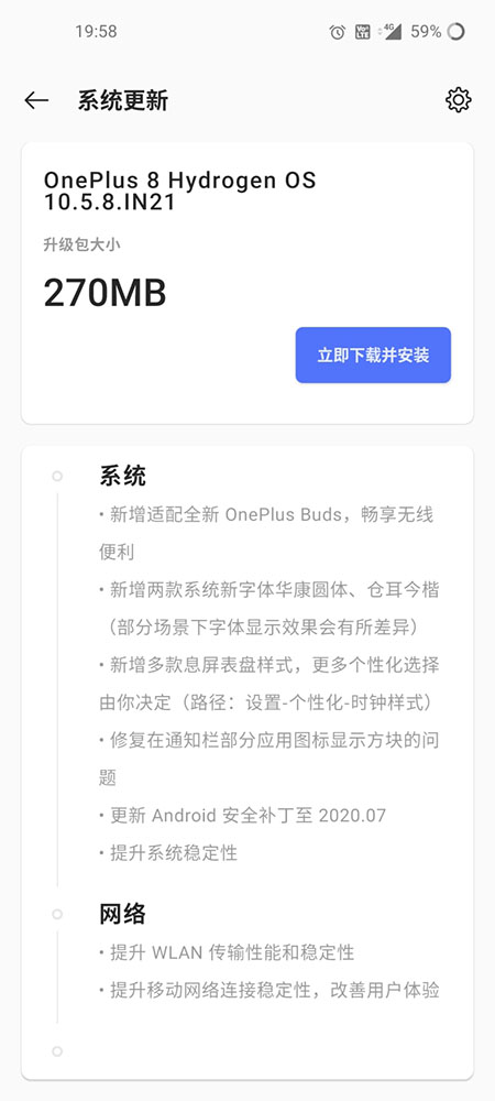一加OnePlus 8在近日推送了這個(gè)10.5.8.IN21版本的升級(jí)更新包,更新的內(nèi)容還是挺多的,新增適配全新 OnePlus Buds,暢享無(wú)線便利,新增兩款系統(tǒng)新字體華康圓體、倉(cāng)耳今楷(部分場(chǎng)景下字體顯示效果會(huì)有所差異),新增多款息屏表盤(pán)樣式,更多個(gè)性化選擇由你決定(路徑:設(shè)置-個(gè)性化-時(shí)鐘樣式),提升 WLAN 傳輸性能和穩(wěn)定性,提升移動(dòng)網(wǎng)絡(luò)連接穩(wěn)定性,改善用戶(hù)體驗(yàn)。