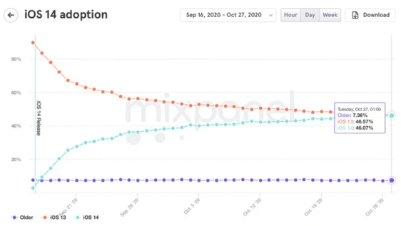 根據(jù)移動(dòng)分析公司Mixpanel的數(shù)據(jù),截止10月27日,iOS 14正式版發(fā)布后五周后,這版系統(tǒng)的采用率即將超過(guò)iOS 13。