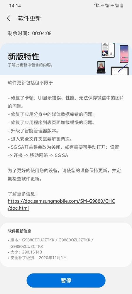 三星Galaxy S20系列現(xiàn)已推送One UI 3.0 beta5版本更新:修復(fù)多個(gè)bug,例如卡頓、UI顯示錯(cuò)誤、性能、無法保存微信中的圖片的問題,默認(rèn)將5GSA設(shè)為關(guān)閉狀態(tài),其他小功能更新暫未發(fā)現(xiàn)。