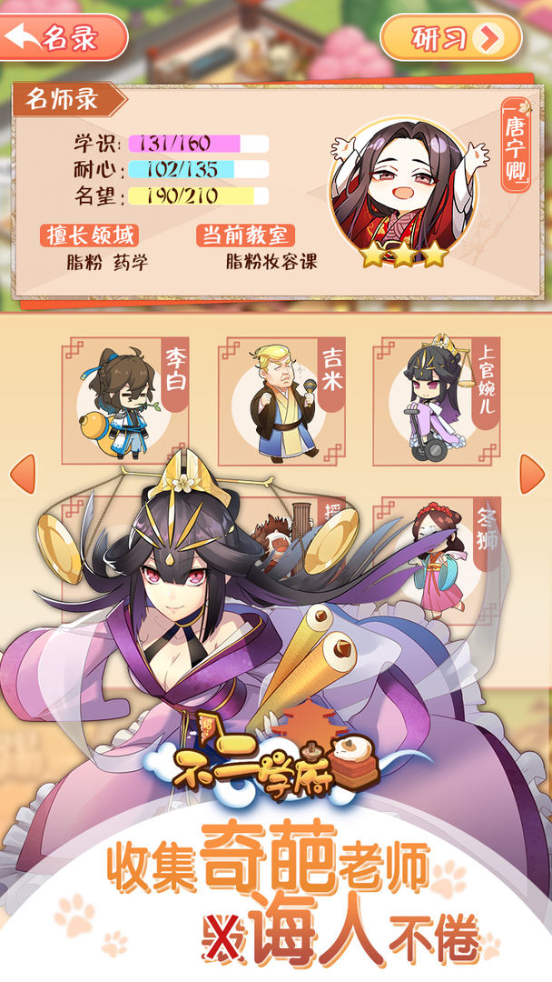 3、德智體美勞全面的發(fā)展,招募頂尖的顏值講師,讓你瘋狂的流口水,隨時(shí)隨地來體驗(yàn)這款二次元古風(fēng)經(jīng)營游戲。