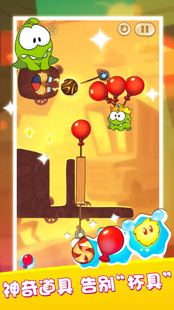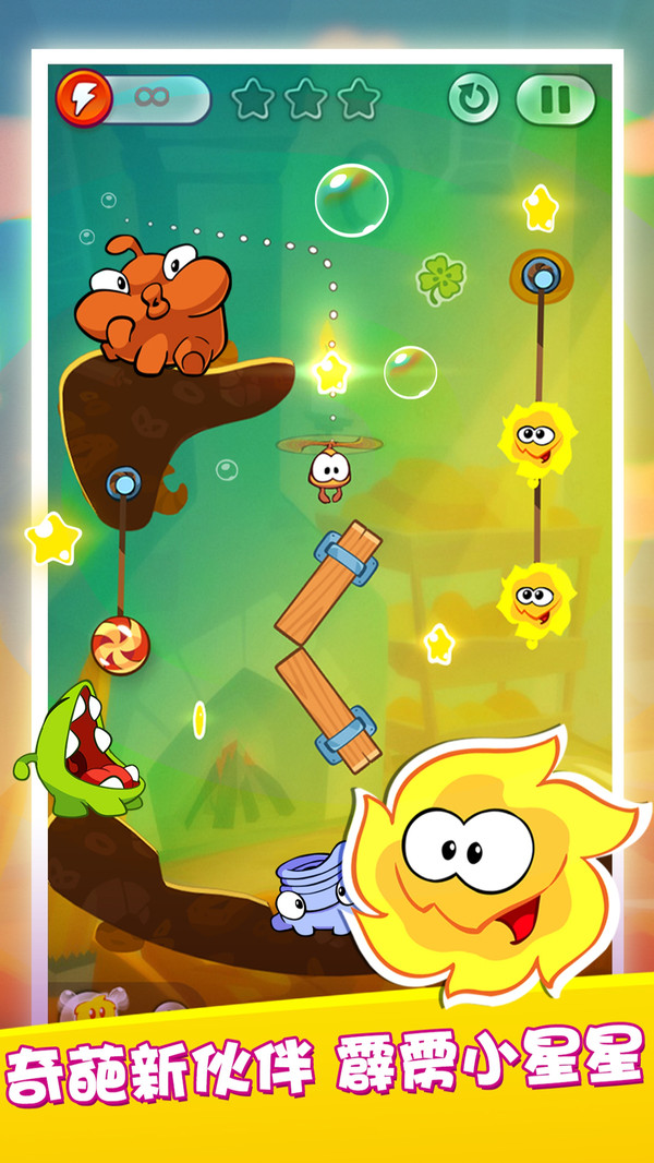 尋找四葉草,開啟隱藏關(guān),完成任務(wù)拿獎牌、為小吃貨精心打扮!一起開動腦筋,圓滿Om Nom的糖果夢吧!