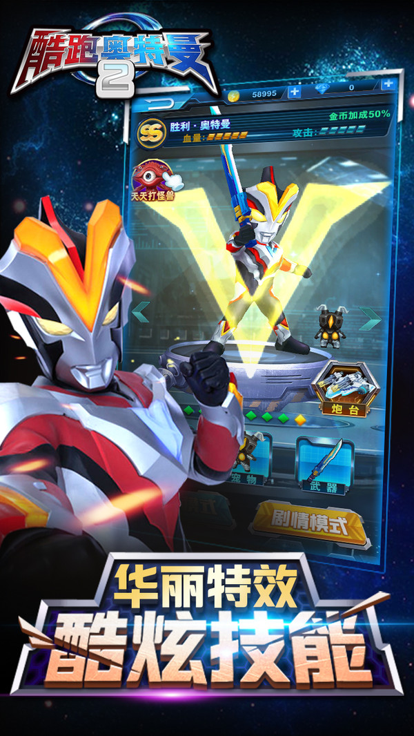 酷跑奧特曼2是一款由動(dòng)漫奧特曼改編而來(lái)的跑酷類游戲,游戲畫(huà)面精致,經(jīng)典還原原著角色,玩家都可以進(jìn)行選擇,在跑酷的過(guò)程中,玩家可以控制角色釋放技能,消滅怪物。玩家將在游戲中化身為夢(mèng)比優(yōu)斯、迪迦、艾克斯等一個(gè)個(gè)熟悉的奧特戰(zhàn)士,對(duì)抗邪惡的怪獸軍團(tuán),一起保衛(wèi)我們的美好地球!快來(lái)集結(jié)你的奧特戰(zhàn)隊(duì),迎戰(zhàn)囂張的巨大BOSS,引爆全新的奧特曼跑酷熱潮! “多樣關(guān)卡 樂(lè)趣無(wú)窮” 游戲中采用關(guān)卡冒險(xiǎn)模式,每個(gè)關(guān)卡的設(shè)計(jì)都獨(dú)具匠心,不同的奧特戰(zhàn)士能在同一個(gè)關(guān)卡中體驗(yàn)到不同的。