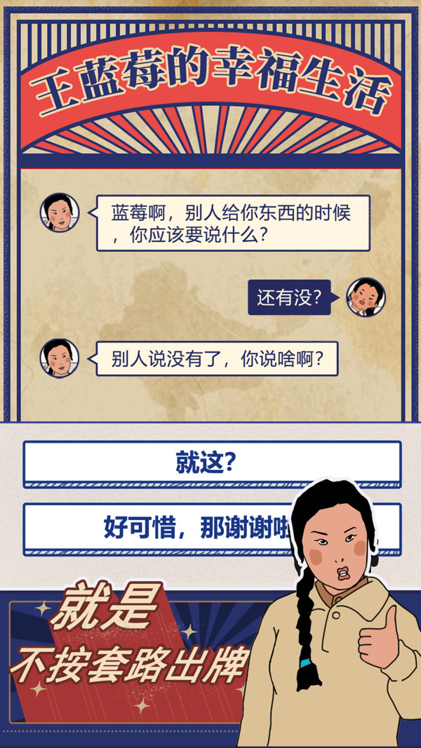 王藍(lán)莓的幸福生活是一款以復(fù)古手繪為美術(shù)風(fēng)格的趣味模擬手游,玩家將被游戲帶回了經(jīng)典的八十年代,扮演一個(gè)小學(xué)生王藍(lán)莓,在游戲中和自己的媽媽斗智斗勇開(kāi)始快樂(lè)的生活。豐富的內(nèi)容玩法模式,還有精心設(shè)計(jì)過(guò)的關(guān)卡玩家能夠自由挑戰(zhàn),還有專門(mén)的分?jǐn)?shù)評(píng)分。王藍(lán)莓正版IP授權(quán)手游,一款融合聊天解謎和放置經(jīng)營(yíng)的休閑游戲,玩家扮演王藍(lán)莓,作為一個(gè)生活在8090年代的小孩,通過(guò)聊天玩法回憶日常生活中的點(diǎn)滴和樂(lè)趣,也會(huì)耍寶和賣(mài)弄流行語(yǔ),通過(guò)對(duì)話,和父母老師同學(xué)進(jìn)行斗智斗勇,不斷成長(zhǎng)。經(jīng)營(yíng)部分通過(guò)放置產(chǎn)生資源,不斷為自己的老家裝修和建設(shè)更多內(nèi)容,同時(shí)提高各個(gè)角色之間的好感等級(jí),不斷收集新的故事內(nèi)容。