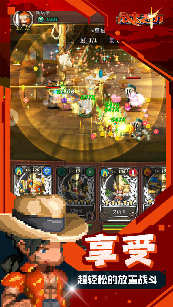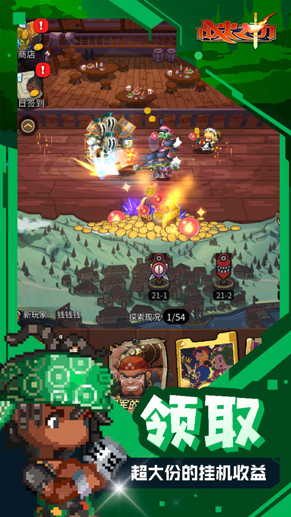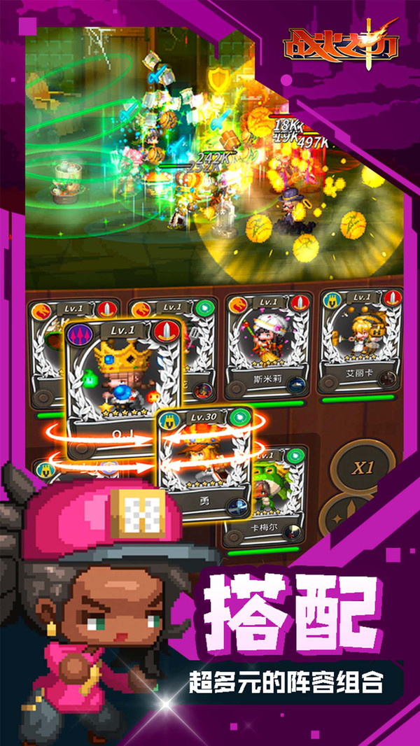 8bit像素 前方高糊預(yù)警 《戰(zhàn)火之初》角色采用8bit像素繪制,游戲整體畫(huà)面為像素與2D卡通畫(huà)面相結(jié)合,復(fù)古中不失精致可愛(ài)。高水準(zhǔn)像素特效應(yīng)用在每一個(gè)角色的技能動(dòng)畫(huà)中,令他們各具特色,喜歡像素風(fēng)游戲的玩家不容錯(cuò)過(guò)! 交替戰(zhàn)斗 玩轉(zhuǎn)無(wú)限火力 游戲的戰(zhàn)斗模式為自動(dòng)戰(zhàn)斗。但與常規(guī)放置卡牌游戲不同的是,《戰(zhàn)火之初》允許攜帶8個(gè)角色卡牌進(jìn)入戰(zhàn)斗,其中5個(gè)作為主力陣容進(jìn)入戰(zhàn)場(chǎng),而另外3個(gè)則可以根據(jù)需要,隨時(shí)替換進(jìn)入。利用角色卡牌的交替戰(zhàn)斗,玩家可以將不同角色的技能進(jìn)行組合連招,用強(qiáng)大的策略擊敗敵人! 多維養(yǎng)成 勇士自由進(jìn)階 《戰(zhàn)火之初》中的全部角色均可進(jìn)階至最高形態(tài)!低階卡牌可以作為合成高階卡牌的材料使用,也就是說(shuō),玩家獲得的全部卡牌均無(wú)廢牌。