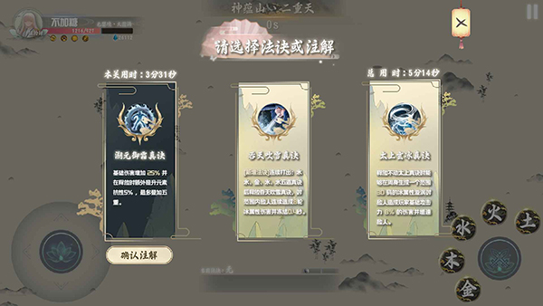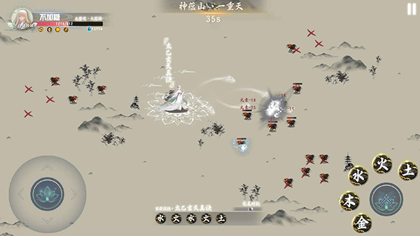 2、游戲中有”金木、水、火、土”五種基本元素, 在戰(zhàn)斗中通過不同的排列組合與合適的釋放時機打出超強法訣;