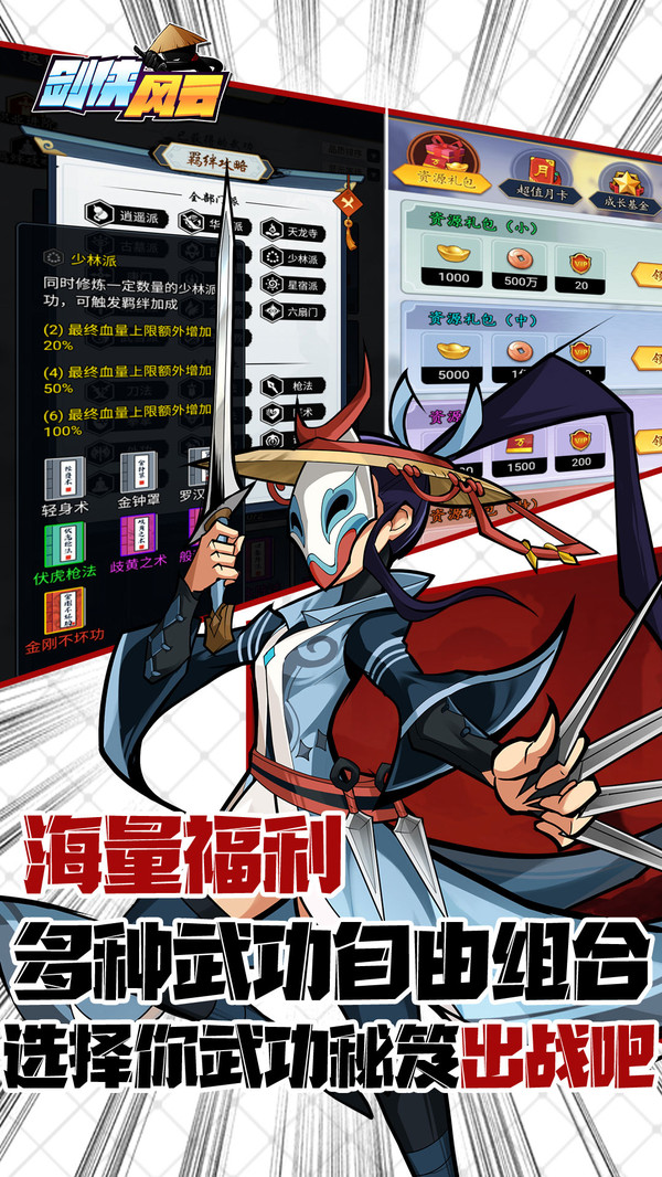 《劍俠風(fēng)云》首創(chuàng)Roguelike+自走棋玩法,5分鐘一把,隨時開打。輕松解壓,好玩不肝,同時又帶有策略配置,游戲中有30種不同的俠客角色,64種不同的武功,14種門派羈絆,10種職業(yè)羈絆。每個俠客都有擅長的天賦技能,每種武功升到滿星還可激活專有特效,可搭配出多種各具特色的武功陣容。豐富的培養(yǎng)玩法,打怪隨機(jī)掉裝備,幾十種不同類型的裝備詞條效果,支持裝備合成。支持掛機(jī)放置玩法,可通過離線掛機(jī)獲取到游戲中的道具物品,有效護(hù)肝。是金剛不壞,還是劍氣凌人,成為什么樣的大俠由你決定,劍俠風(fēng)云游戲當(dāng)中的經(jīng)典古風(fēng)畫面,為玩家?guī)砣碌囊曈X體驗(yàn),新人玩家上線會有大禮包相送,快速的培養(yǎng)自己的角色,還有VIP可以領(lǐng)取。海量的裝備可以隨時領(lǐng)取,帶來強(qiáng)大的戰(zhàn)斗力,神器時裝都可以在戰(zhàn)boss當(dāng)中掉落,玩家可以快速的領(lǐng)取,帶來強(qiáng)大的戰(zhàn)斗力。