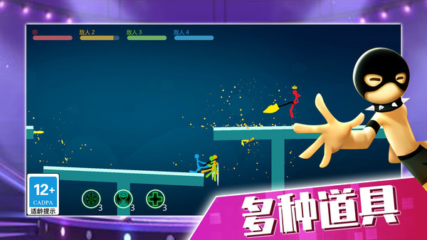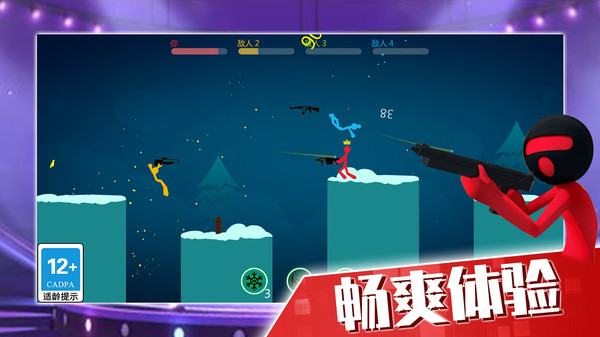 《火柴人大決戰(zhàn)》是一款格斗游戲,游戲內(nèi)不止挑戰(zhàn)一個(gè)敵人,而是4人亂斗,你可以通過操控火柴人的攻擊方向,來抵御或者攻擊不斷前進(jìn)的敵人對手火拼,浴血?dú)场R部梢宰接^虎斗等到時(shí)機(jī)成熟,在出來將他們一舉消滅。天上會開始掉落隨機(jī)武器,有刀、矛等冷兵器,也有槍除此之外還有功能型武器,比如時(shí)間靜止槍、火焰加速器等等。游戲打擊感超強(qiáng),火力全開,激情四射,并且還可以通過選擇各具特色的武器為你贏得勝利,搞怪、亂斗、連擊、暴擊秒殺爽快感爆棚!你還不來么,玩家們將化身成為一只強(qiáng)大的火柴人戰(zhàn)士在場景中與眾多的敵人進(jìn)行大決戰(zhàn)喲,每一位敵人都是單兵作戰(zhàn),玩家們需要將敵人逐個(gè)擊破,消滅所有的敵人,玩家們才能贏得最終豐厚的游戲獎勵(lì)喲,在特定的機(jī)會下玩家們還可以為敵人準(zhǔn)備陷阱喲,將所有的敵人全部一網(wǎng)打盡,感興趣的玩家們快來下載挑戰(zhàn)吧。