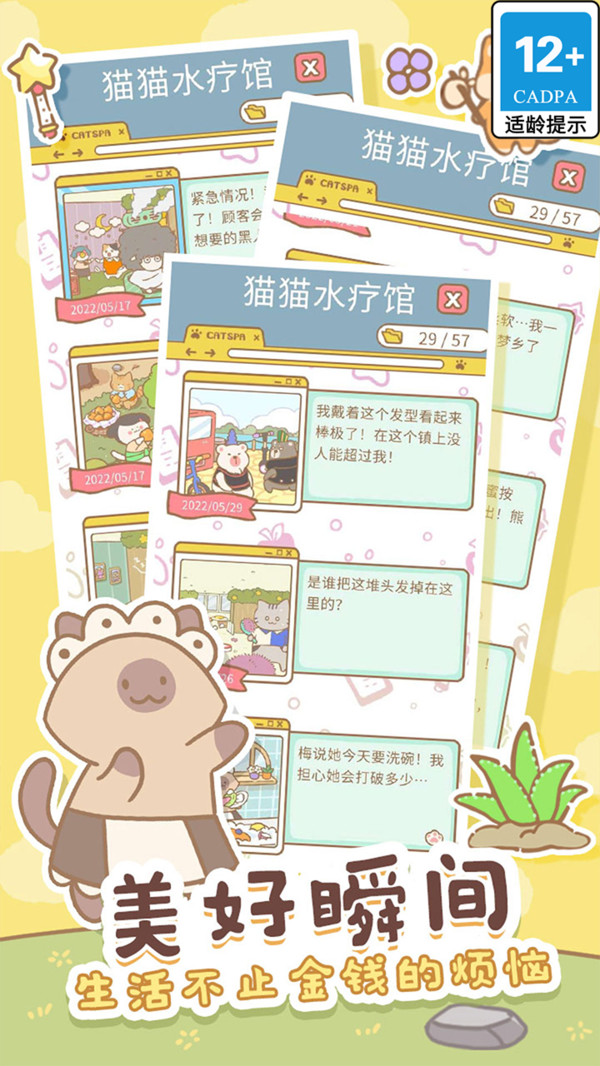貓貓水療館是一款以貓貓為主角的模擬經(jīng)營(yíng)類游戲,游戲中采用了治愈的動(dòng)畫設(shè)計(jì),為貓貓?jiān)O(shè)計(jì)了各種不同的任務(wù)。玩家可以通過完成任務(wù),獲取各種獎(jiǎng)勵(lì),不斷擴(kuò)大店面和提升服務(wù)。 置身游戲,玩家可以放松身心,享受擼貓的愜意生活~ 經(jīng)營(yíng)水療館,接待萌萌的顧客,體驗(yàn)別樣的開店樂趣。貓貓水療館官方版游戲中打造了一個(gè)有趣的全是貓貓的水療館,在游戲中有很多可愛的小貓,每一只都非常的可愛,這些可愛的小貓可以幫助玩家經(jīng)營(yíng)自己的店鋪,并且讓小貓幫助你吸引更多的客人,為你帶來更多的財(cái)富。