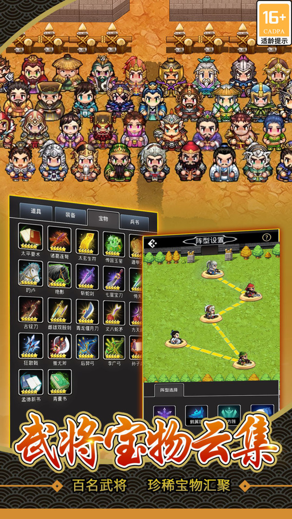 -武將寶物云集 收集隱藏武將- 眾多歷史英雄悉數(shù)登場(chǎng),你可以招募諸葛亮、呂布、曹操等著名武將,收集他們的絕世寶物;還可以探索野外劇情,“捕捉”隱藏武將。 每個(gè)武將和寶物均有不同的特性,合理搭配定能馳騁戰(zhàn)場(chǎng),彰顯主公智慧~