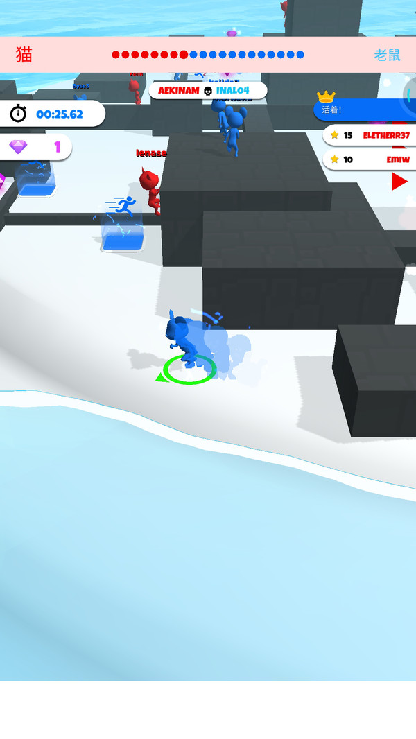 游戲分為兩個陣營。紅色陣營的“貓”和藍(lán)色陣營的“老鼠”。藍(lán)色小人被抓到后會變成紅色小人,之后幫紅色小人抓其他藍(lán)色小人。游戲畫面簡潔,地圖很大,還有很多的黑色方塊,對玩家的走位要求比較高。喜歡的玩家可以下載體驗(yàn)。貓捉老鼠大作戰(zhàn)玩家可以任選一方,然后在四面是水的平臺上面相互追捕,任何一方追到另一方的小人都能讓它的顏色變成自己的一方,非常的好玩,貓的任務(wù)就是抓住那些逃跑的老鼠將其同化,玩起來簡單易上手,也很休閑解壓,需要利用場景的障礙物地形躲避貓咪的抓捕,很是考驗(yàn)玩家的走位。