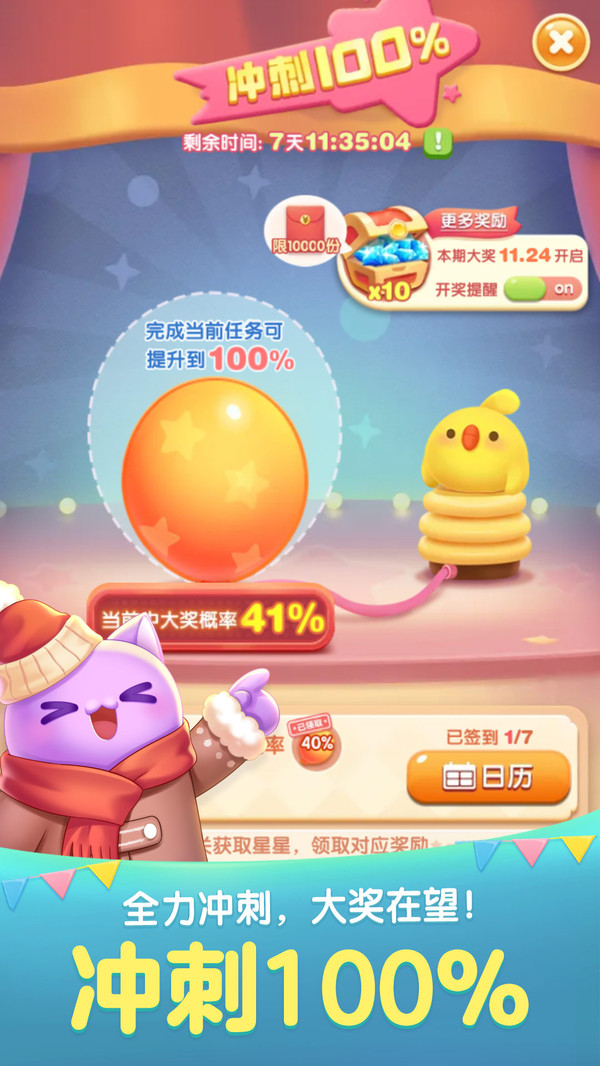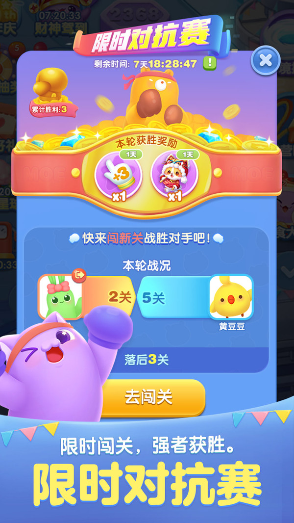 天天愛(ài)消除是一款以“消除煩惱,治愈心靈”為主題的萌系治愈向消除手游,陪伴玩家度過(guò)了7個(gè)寒暑!輕劃手指,將三個(gè)相同的小動(dòng)物旗子連成一行或一列,即可完成一次消除哦!巧妙安排消除時(shí)機(jī),靈活運(yùn)用消除道具和關(guān)卡機(jī)制,為你的消除旅程插上翅膀吧!開發(fā)組目前精心制作了將近3000個(gè)關(guān)卡,120多種豐富逗趣的關(guān)卡元素,更有冒險(xiǎn)模式、經(jīng)典模式、換裝玩法、家裝玩法、塔防玩法等多種游戲模式等你體驗(yàn)!新的游戲玩法還在不斷地推出中! 徜徉在奇妙夢(mèng)幻的夢(mèng)境云海里,和暖萌國(guó)民IP大使喵星星、黃豆豆、琦琦熊、果果兔一起,運(yùn)用消除的力量,把人們夢(mèng)里的煩惱和愁云都清理掉!在消除聯(lián)萌的暖心守護(hù)下,一起做一些甜甜的美夢(mèng)吧!