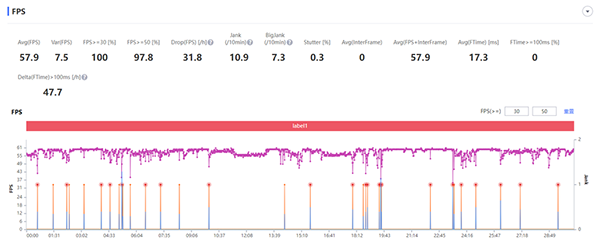 在對(duì)系統(tǒng)配置要求非常高的《原神》手游中,采用極高+60幀畫質(zhì)組合,在游戲中進(jìn)行戰(zhàn)斗場(chǎng)景以及跑圖測(cè)試。在將近半小時(shí)的游戲過程中,PerfDog軟件記錄的平均幀數(shù)為57.9幀,接近滿幀運(yùn)行,有97.8%的時(shí)間里幀數(shù)都不低于50幀。雖然偶爾會(huì)出現(xiàn)一點(diǎn)小卡頓,但整體能夠提供不錯(cuò)的畫面流暢度,而且值得注意的是,測(cè)試是在極高畫質(zhì)下進(jìn)行,如果適當(dāng)降低畫質(zhì)或者在一些相對(duì)低負(fù)載的場(chǎng)景下進(jìn)行操作,幀數(shù)方面應(yīng)該會(huì)有更好的表現(xiàn)。