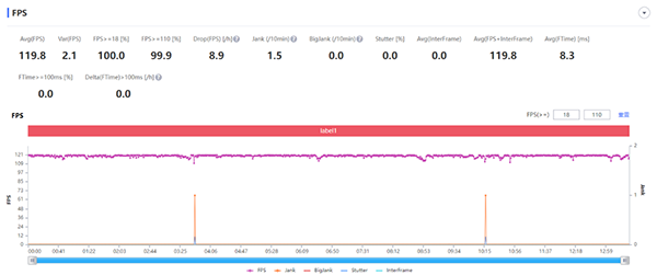 在幀率增強(qiáng)功能的支持下,《王者榮耀》可開啟120幀率和極 致畫面總質(zhì)量,本次測(cè)試在最 高畫質(zhì)設(shè)置下進(jìn)行。PerfDog軟件記錄到的平均幀數(shù)為119.8幀,大部分時(shí)間游戲都能保持在110幀以上,在5V5對(duì)局當(dāng)中幾乎能夠全程跑滿,幀率波動(dòng)十分平穩(wěn),整體游戲表現(xiàn)非常流暢。