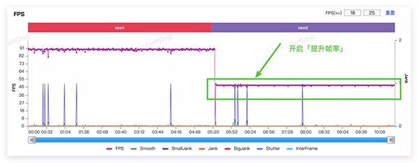 《和平精英》同理,如下圖所示,10分鐘的游戲演示里,前五分鐘為默認(rèn)90幀游戲,后五分鐘可開啟「提升幀率」功能后,此時(shí)GPU只需要渲染48幀,然后插幀3倍實(shí)現(xiàn)144幀的效果。