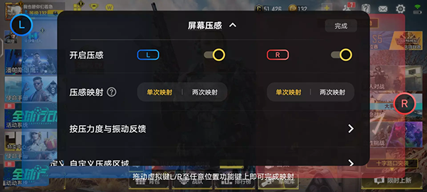 你可以將左右兩側(cè)的按壓區(qū)域映射游戲中相應(yīng)的功能按鍵,從而實(shí)現(xiàn)兩個(gè)維度的操作,對(duì)于《使命召喚》《和平精英》這類極其考驗(yàn)手速的游戲來說,左右屏幕壓感可以極大的提高游戲的操作效率。