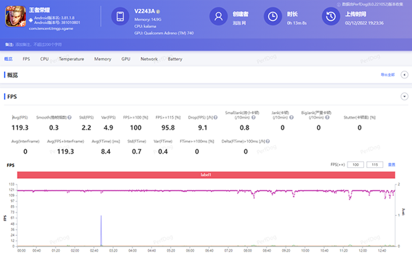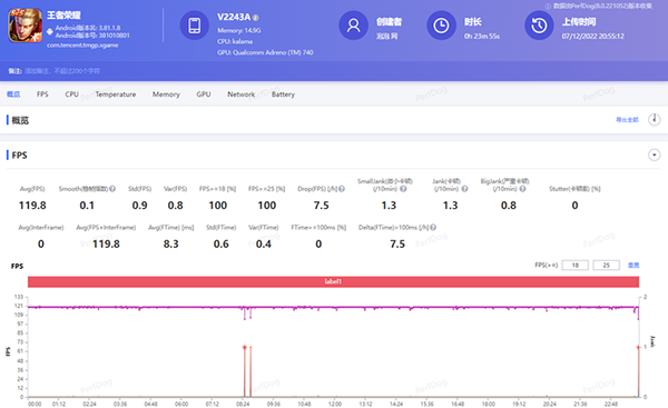 與此同時(shí),iQOO 11還適配了《王者榮耀》極 致畫(huà)質(zhì)+120幀的模式。在這一模式下再進(jìn)行測(cè)試,可以看到iQOO 11的平均幀率仍然是接近滿(mǎn)幀的,雖然團(tuán)戰(zhàn)中開(kāi)始出現(xiàn)了一些小掉幀,不過(guò)全程的幀率都完全沒(méi)有跌破100幀,游玩的感受還是十分流暢的。