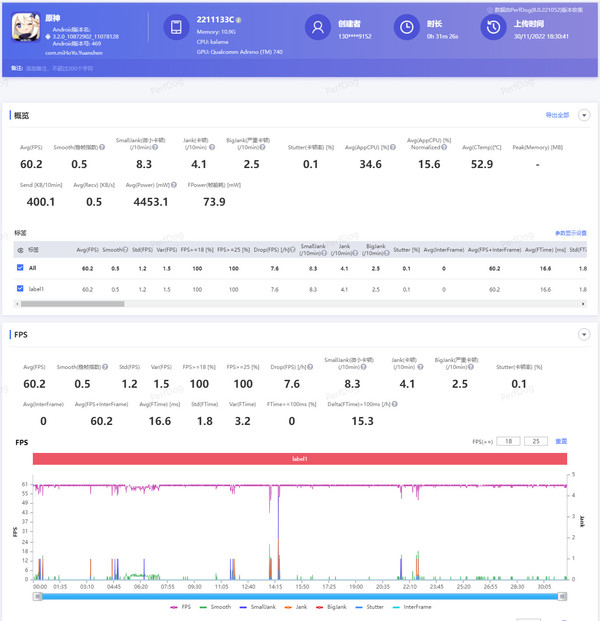 我們以《原神》為例,經過半小時左右的游戲時長我們可以看到,在開啟性能模式并將畫質設置為720p之后,小米13全程保持在60幀以上,除了開啟菜單或者切換場景時必須進行的停頓,在其他時間里都保持了高幀率的畫面運行。甚至我們可以看到,使用小米13 Pro進行游戲時候畫面更清晰,人物動作更流暢,顏色和細節(jié)表現(xiàn)也更加優(yōu)秀。在游戲測試時并無明顯的溫度變化,從數據上也可以看出溫度曲線趨于平緩,且機身溫度維持在36.5左右,手感溫度提升變化平穩(wěn)。